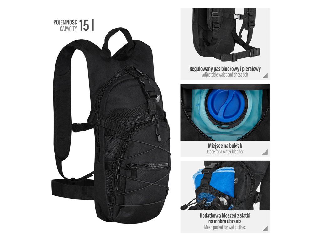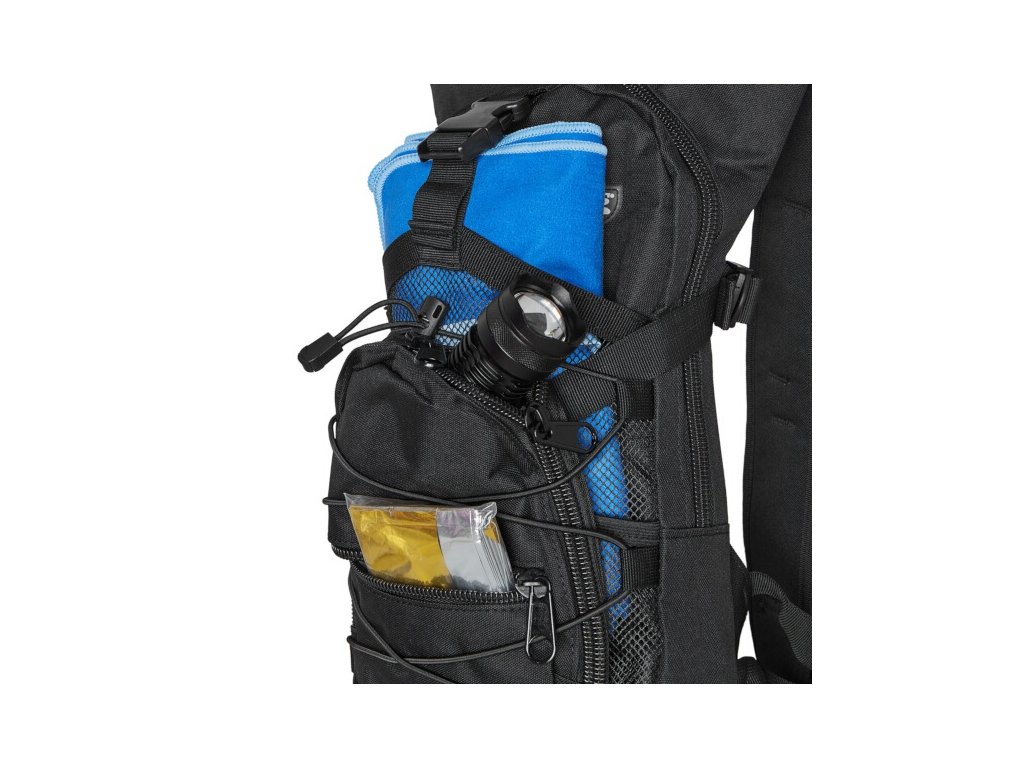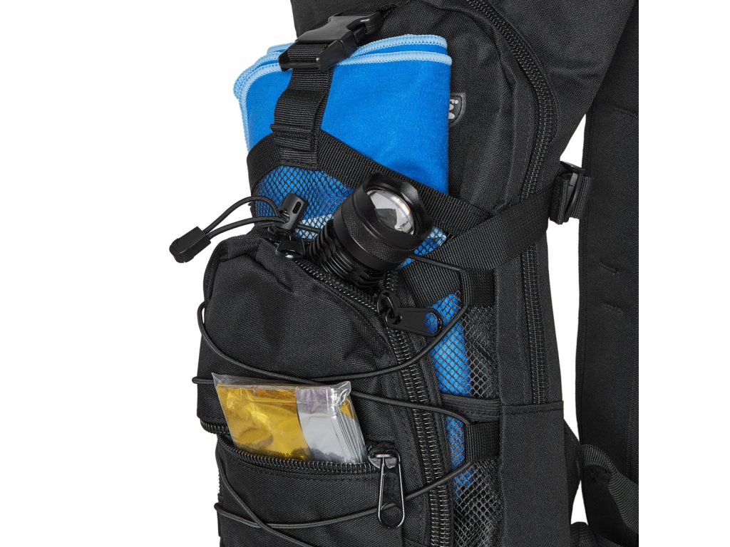 Hlavní komora batohu je opatřena přepážkou, v horní části se nachází 2 karabiny pro zavěšení hydrovaku (není součástí dodávky). Hadičku hydrovaku lze vyvést průvlaky na pravé i na levé straně pod ramenními panely. Na hlavní komoře se nacházejí další úložné prostory a to velká síťovaná kapsa s popruhem a přezkou - menší otevřená, síťovaná kapsa - 2. komora na zip - kapsa na zip (například pro mobilní telefon a peněženku) a gumová šňůra s brzdičkou, pod kterou lze přenášet například cyklistickou helmu, nebo karimatku. Po stranách batohu se nachází kompresní popruhy, které stahují hlavní komoru a obě síťované kapsy. Na horní straně je robustní ucho pro pohodlné přenášení batohu v ruce. Zadní strana a ramenní popruhy jsou polyesterové bez polstrování. Na popruzích je gumové poutko k provlečení hadičky hydrovaku a hrudní popruh, ten je výškově a délkově nastavitelný. Bederní popruh s robustní přezkou má šířku 3,5 centimetru.
