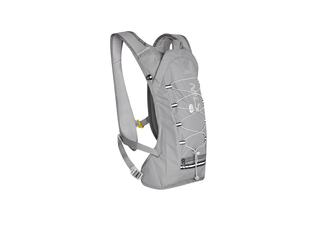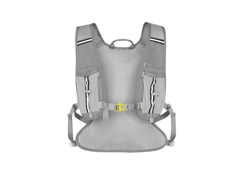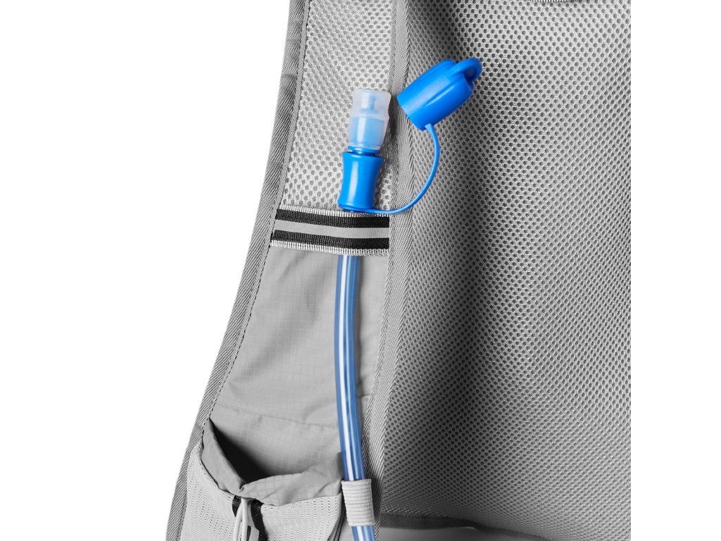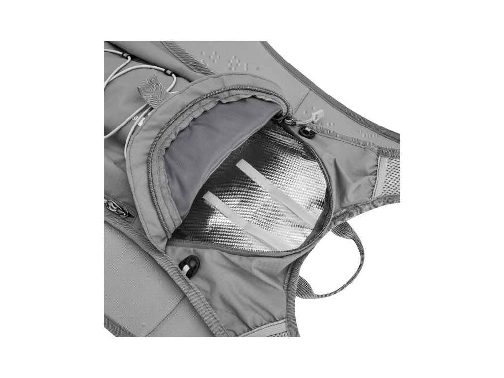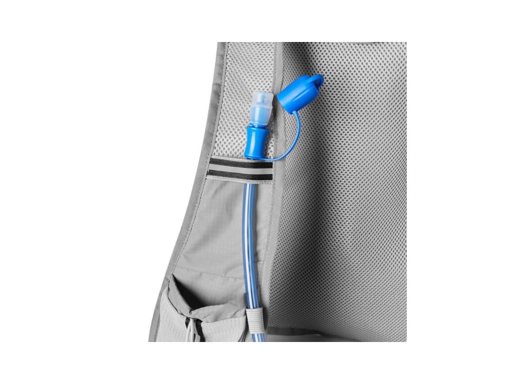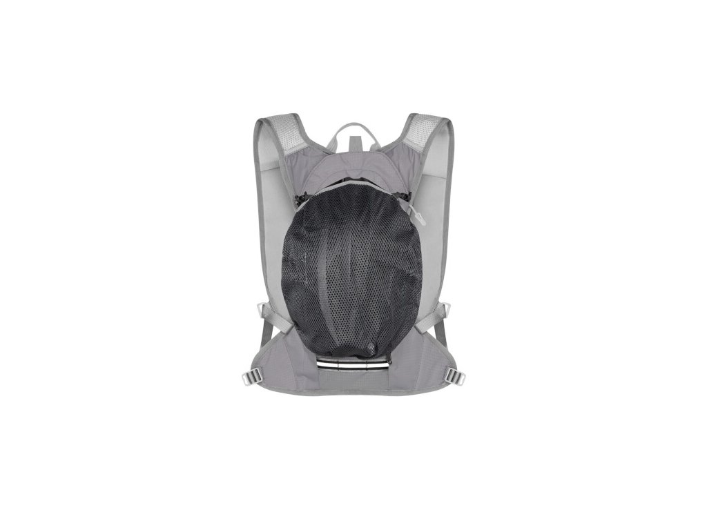 Hlavní komora batohu je opatřena přepážkou, v horní části se nachází 2 suché zipy pro zavěšení hydrovaku (není součástí dodávky). Zadní strana hlavní komory je opatřena hliníkovou fólií, která slouží jako izolace mezi hydrovakem a zády, takže nápoj se nebude ohřívat teplem od zad. Hadičku hydrovaku lze vyvést průvlaky na pravé i na levé straně pod ramenními panely. Přední strana batohu je opatřena gumovým lankem s brzdičkou, pod které lze uložit například karimatku. Níže nalezneme kapsu, ve které se skrývá síťka, kterou lze vytáhnout a pomocí karabinek připnout ke stranám batohu, síťka následně vytvoří kapsu, co které můžeme uložit například cyklistickou helmu, ešus apod.. Pod kapsou je reflexní panel, ke kterému si můžeme připnout další vybavení. Na pravé straně se skrývá další kapsa na zip, která je ideální pro telefon, peněženku, nebo například klíče. Na horní straně batohu je poutko pro snadné přenášení batohu v ruce. Záda a ramenní popruhy jsou vyrobeny ze síťoviny doplněné o prodyšnou pěnu, která zvyšuje prodyšnost panelu a záda se budou méně potit. Ramenní popruhy jsou opatřeny reflexními řemínky pro protažení hadičky od hydrovaku a kapsami ze síťoviny. Na levém popruhu se navíc nachází kapsička s průhlednou čelní stranou, do které lze uložit například kartičku pro případ ztráty, startovní číslo a podobně. Ramenní popruhy jsou spojeny hrudním pásem, který lze výškově nastavit. Popruh je spojen plastovou přezkou s píšťalkou.
