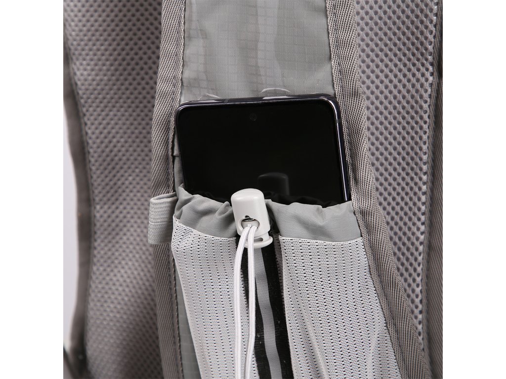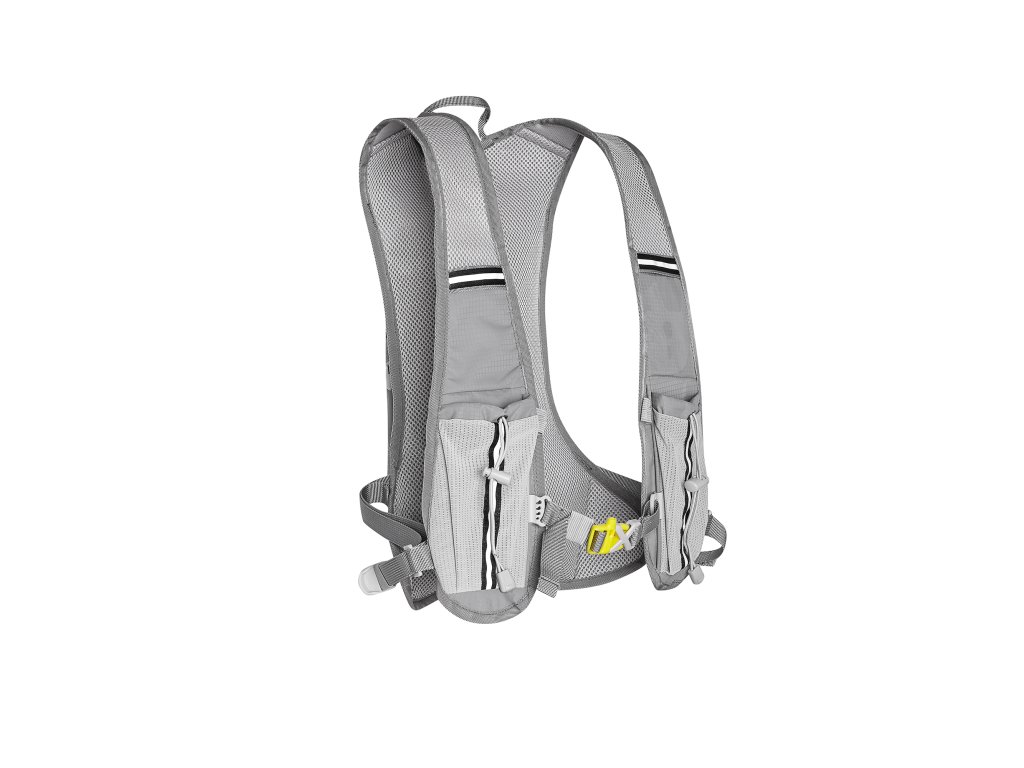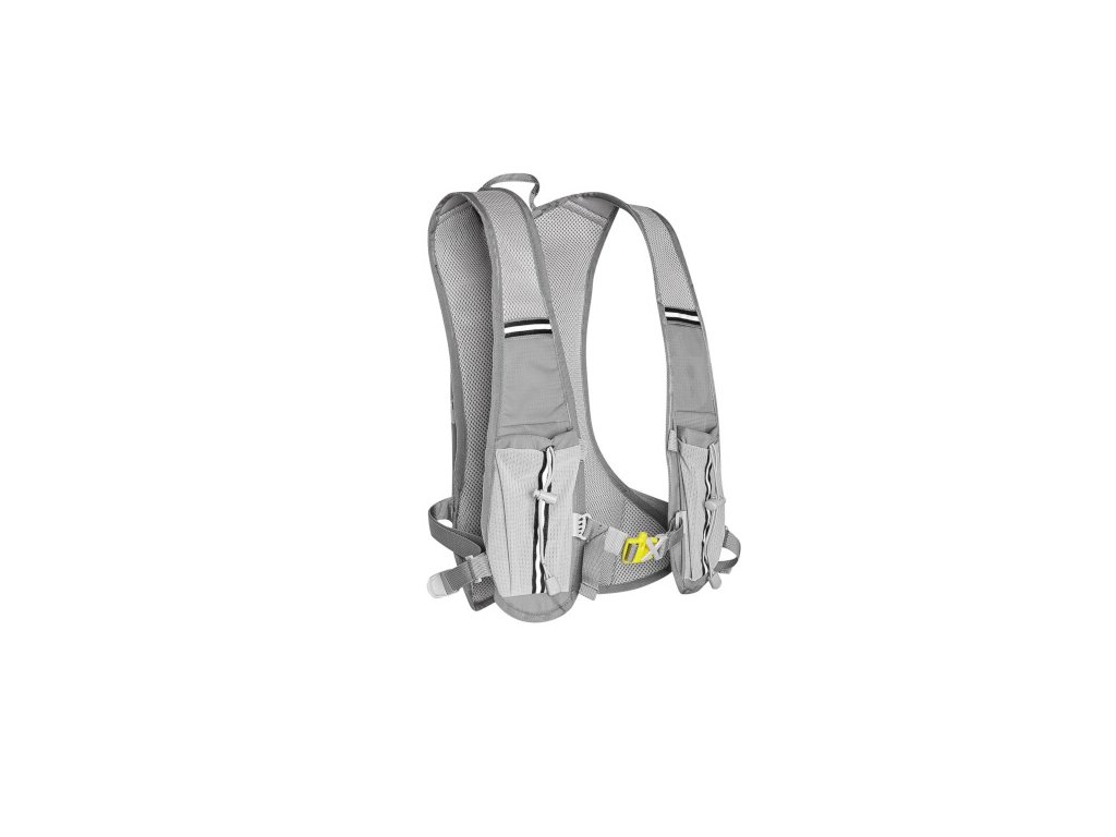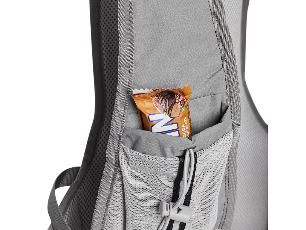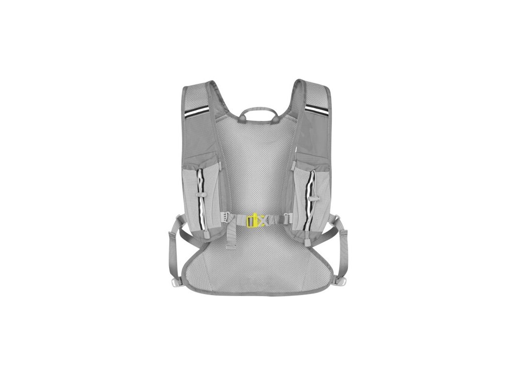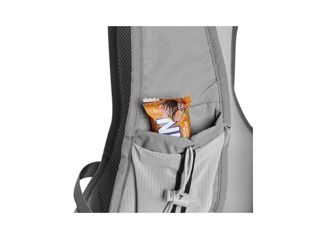 Hlavní komora batohu je opatřena přepážkou, v horní části se nachází 2 suché zipy pro zavěšení hydrovaku (není součástí dodávky). Zadní strana hlavní komory je opatřena hliníkovou fólií, která slouží jako izolace mezi hydrovakem a zády, takže nápoj se nebude ohřívat teplem od zad. Hadičku hydrovaku lze vyvést průvlaky na pravé i na levé straně pod ramenními panely. Přední strana batohu je opatřena gumovým lankem s brzdičkou, pod které lze uložit například karimatku. Níže nalezneme kapsu, ve které se skrývá síťka, kterou lze vytáhnout a pomocí karabinek připnout ke stranám batohu, síťka následně vytvoří kapsu, co které můžeme uložit například cyklistickou helmu, ešus apod.. Pod kapsou je reflexní panel, ke kterému si můžeme připnout další vybavení. Na pravé straně se skrývá další kapsa na zip, která je ideální pro telefon, peněženku, nebo například klíče. Na horní straně batohu je poutko pro snadné přenášení batohu v ruce. Záda a ramenní popruhy jsou vyrobeny ze síťoviny doplněné o prodyšnou pěnu, která zvyšuje prodyšnost panelu a záda se budou méně potit. Ramenní popruhy jsou opatřeny reflexními řemínky pro protažení hadičky od hydrovaku a kapsami ze síťoviny. Na levém popruhu se navíc nachází kapsička s průhlednou čelní stranou, do které lze uložit například kartičku pro případ ztráty, startovní číslo a podobně. Ramenní popruhy jsou spojeny hrudním pásem, který lze výškově nastavit. Popruh je spojen plastovou přezkou s píšťalkou.