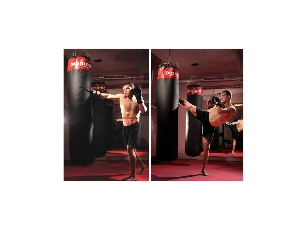 Profesionální boxovací pytel DBX BUSHIDO 180 x 45 cm. Délka řetězů při zavěšení 45 cm (díky karabině lze nastavit i kratší délku).