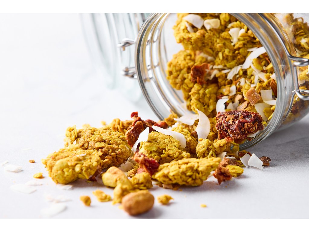 Křupavá směs s nádechem exotiky Bezlepkové ovesné BIO vločky z Finska jsme zapekli a smíchali spolu s kousky lahodného manga a papaji. Sladkou chuť granole propůjčil kokosový sirup a kešu krém spolu s celými křupavými kousky kešu ořechů. Ghí z BIO mléka V granole nenajdete cukr ani palmový olej. Roli tuku v granole zastupuje ghíčko, které pochází z BIO mléka od českých krav. Ghí neobsahuje laktózu, kasein a navíc podporuje zdraví střevní výstelky, protože je bohaté na butyrát. BrainPedia.cz - místo nabité informacemi! Se správnými informacemi nelze udělat špatné rozhodnutí. Výživové hodnoty na 100 g Energetická hodnota 444 kcal / 1855 kJ Tuky 43,48 g - z toho nasycené mastné kyseliny 9,41 g Sacharidy 47,16 g - z toho cukry 22,89 g Vláknina 7,51 g Bílkoviny 10,34 g Sůl 0,16 g Výživové hodnoty na porci (30 g) Energetická hodnota 133 kcal / 557 kJ Tuky 13,04 g - z toho nasycené mastné kyseliny 2,82 g Sacharidy 14,15 g - z toho cukry 6,87 g Vláknina 2,25 g Bílkoviny 3,13 g Sůl 0,05 g BIO certifikace CZ-BIO-001 Náše granola má BIO certifikát - Produkce ekologického zemědělství EU / mimo EU. Nákupem podpoříte i české lesy #stromzaobjednavku! Složení: bezlepkové ovesné vločky*, kešu krém*, kešu ořechy*, kokosový sirup*, (8 %) sušené mango kostičky*, (8 %) sušená papaya kostičky*, kokosové chipsy v ananasové polevě, přepuštěné máslo ghí*, kurkuma*, sůl. *produkt z ekologického zemědělství. Obsahuje 100 % surovin zemědělského původu v BIO kvalitě. Minimální trvanlivost (číslo šarže) na boční straně. Původ: EU/mimoEU. Vyrobeno v ČR. Distributor: BRAINMARKET s.r.o., Hladnovská 83/93, Ostrava Skladování: Uchovávejte v suchu a nevystavujte přímému slunečnímu záření. Po otevření spotřebujte do 2 měsíců. Hmotnost: 400 g