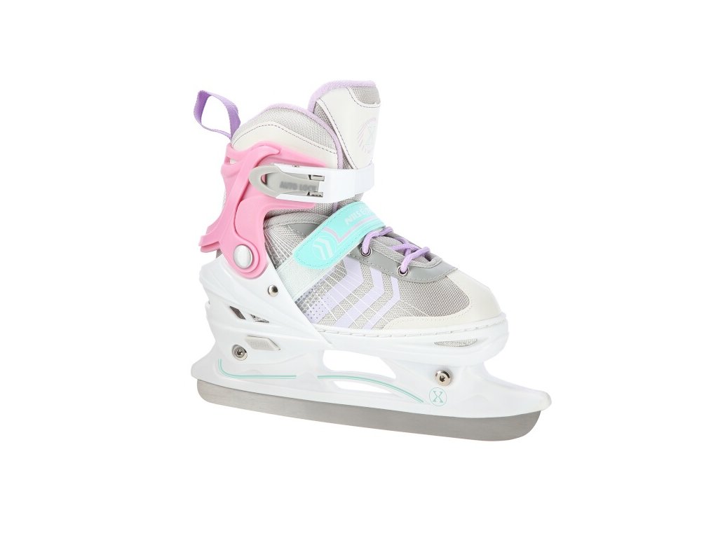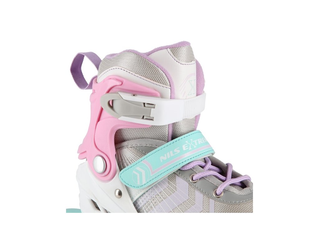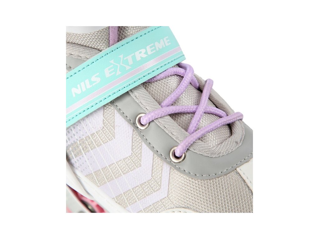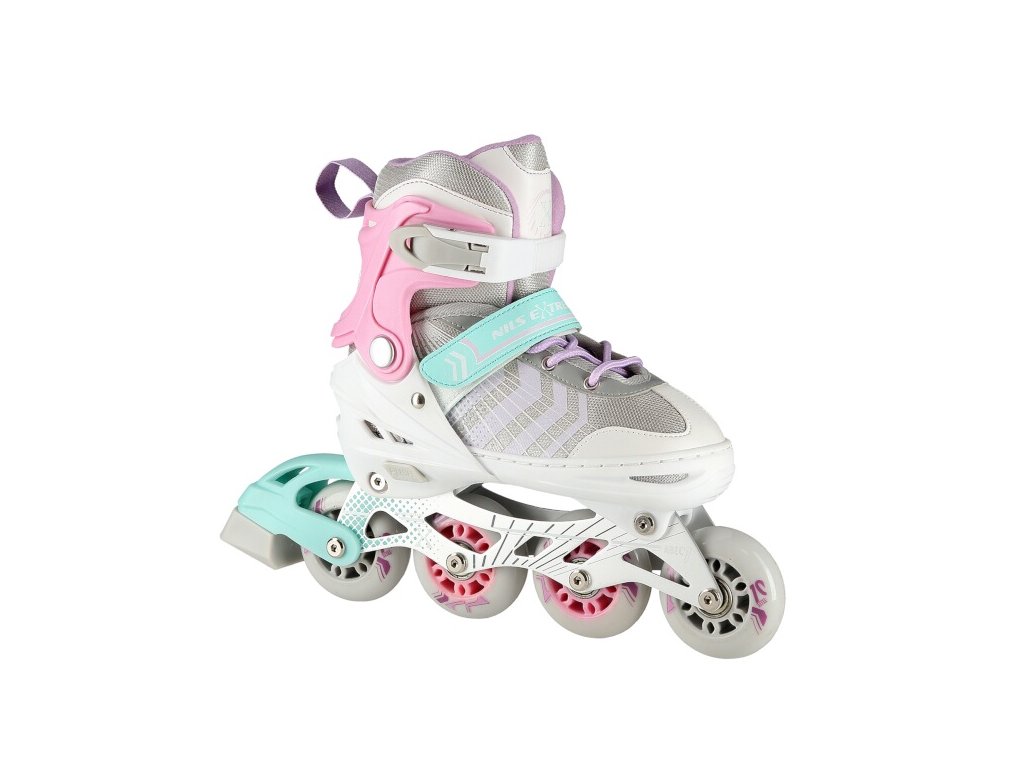 NILS Extreme NH18192 jsou kolečkové brusle 4v1 s vyměnitelným nožem na led, které jsou určeny pro začínající a středně pokročilé uživatele. Hliníkový podvozek je osazen měkkými PU kolečky s ložisky ABEC7 pro svižnou jízdu. Vnější bota je pomocí stisku tlačítka nastavitelná do čtyř velikostí, toto řešení umožňuje precizní přizpůsobení velikosti podle aktuálních potřeb anebo se používá jako "rostoucí bota", která "roste" spolu s nohou dítěte. Na špičce jsou ventilační otvory pro maximální prodyšnost. Vnitřní bota je vyrobena z kombinace semiše, síťoviny MESH, EVA a pěny o vysoké hustotě. Zapínání je řešenou klasickou trojkombinací - šněrování, řemínek se suchým zipem a dvousekční přezka. Součástí balení je sada šroubů a podložek pro přestavbu podvozku do konfigurace 2+1 a 2+2 a pár nožů na led, které jsou vyrobeny z nerez oceli s vysokým podílem uhlíku.