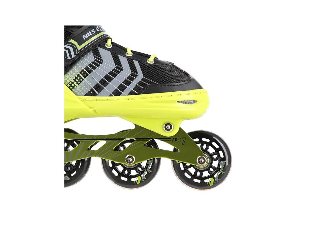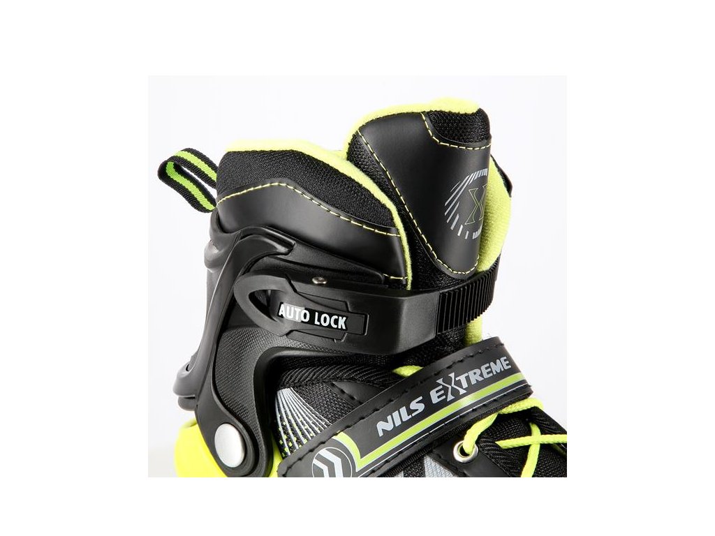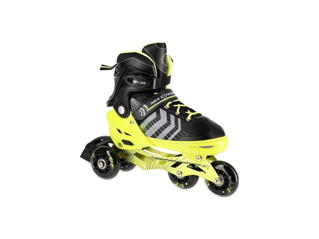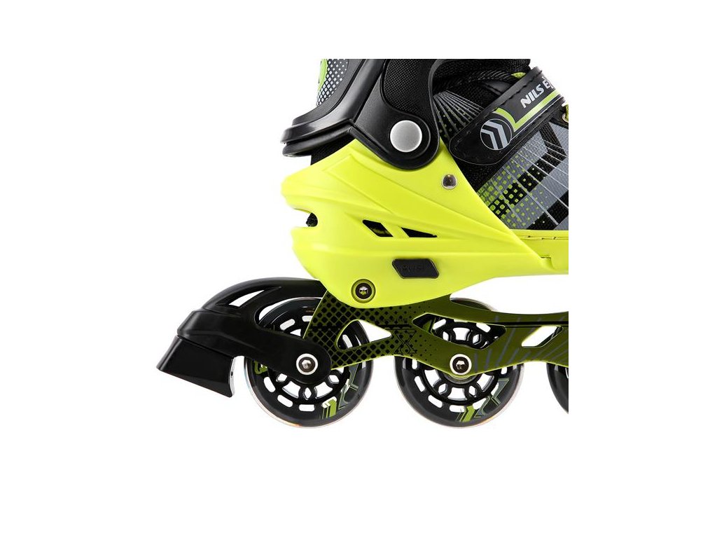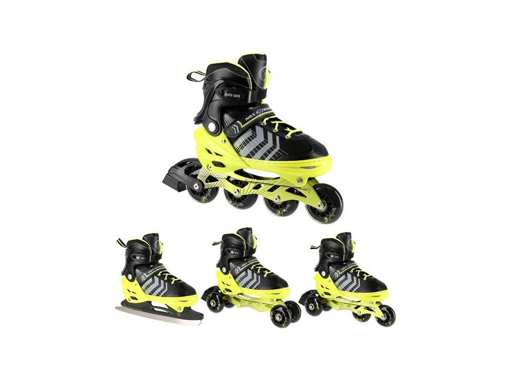 NILS Extreme NH18192 jsou kolečkové brusle 4v1 s vyměnitelným nožem na led, které jsou určeny pro začínající a středně pokročilé uživatele. Hliníkový podvozek je osazen měkkými PU kolečky s ložisky ABEC7 pro svižnou jízdu. Vnější bota je pomocí stisku tlačítka nastavitelná do čtyř velikostí, toto řešení umožňuje precizní přizpůsobení velikosti podle aktuálních potřeb anebo se používá jako "rostoucí bota", která "roste" spolu s nohou dítěte. Na špičce jsou ventilační otvory pro maximální prodyšnost. Vnitřní bota je vyrobena z kombinace semiše, síťoviny MESH, EVA a pěny o vysoké hustotě. Zapínání je řešenou klasickou trojkombinací - šněrování, řemínek se suchým zipem a dvousekční přezka. Součástí balení je sada šroubů a podložek pro přestavbu podvozku do konfigurace 2+1 a 2+2 a pár nožů na led, které jsou vyrobeny z nerez oceli s vysokým podílem uhlíku.