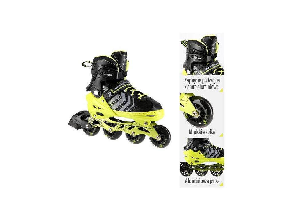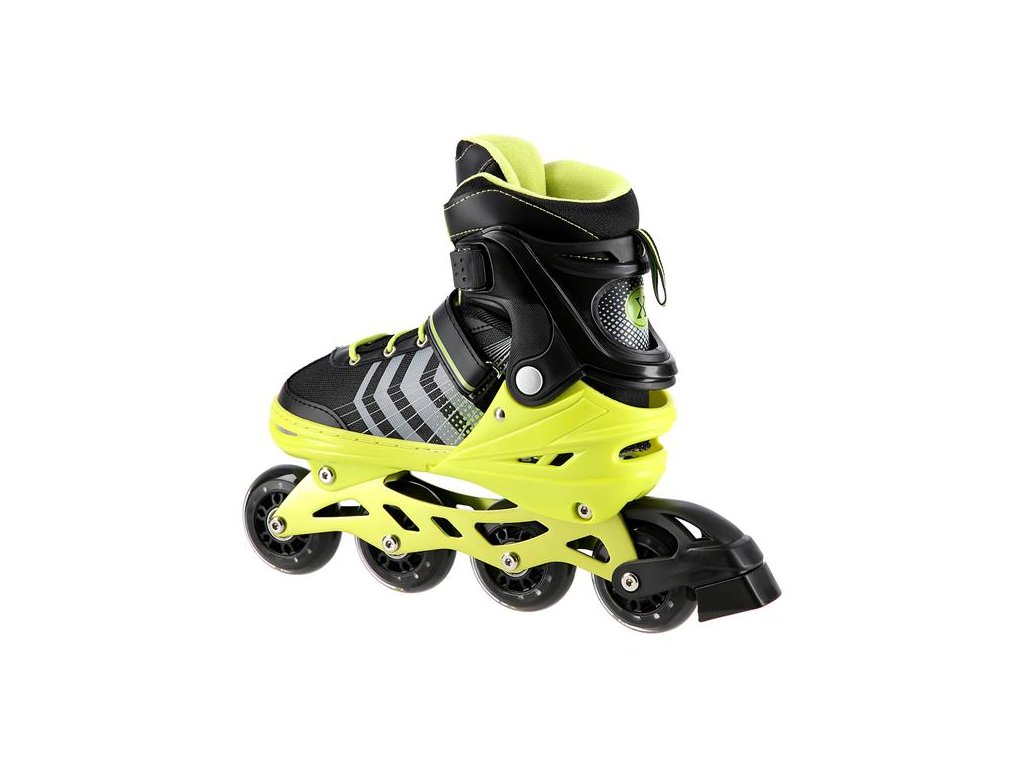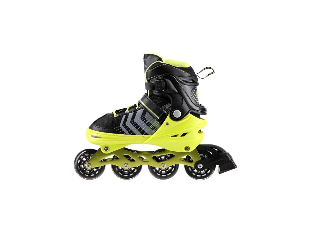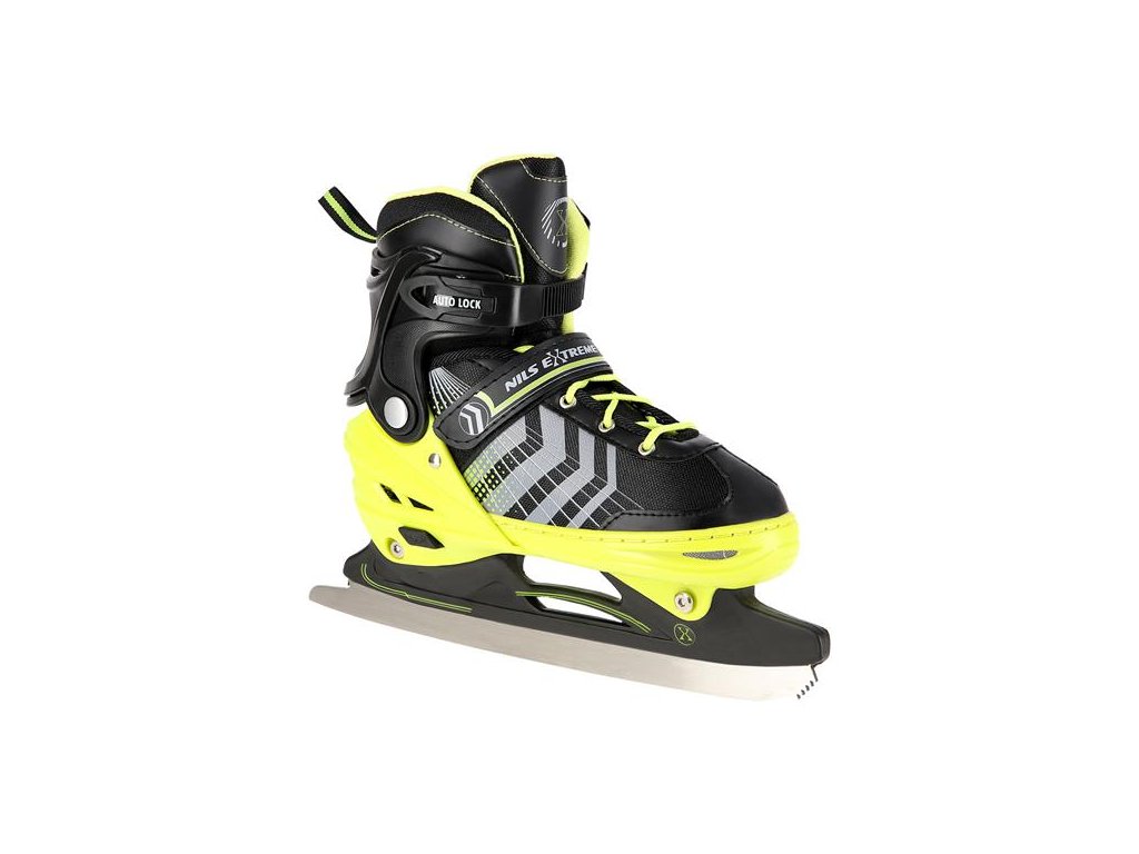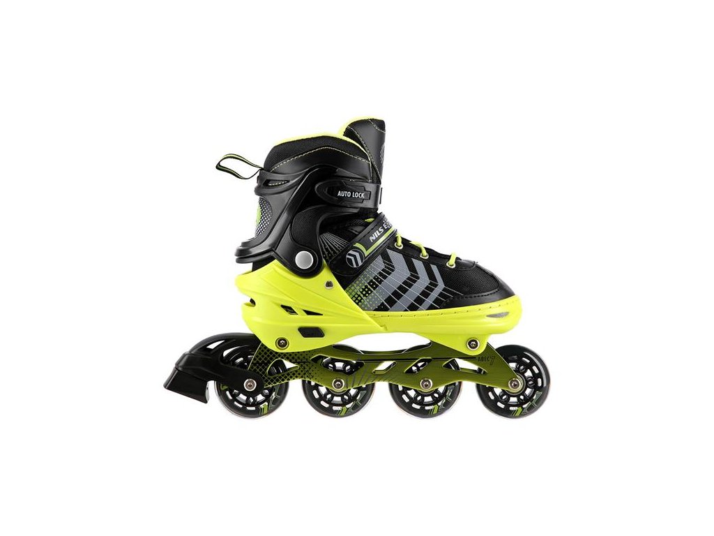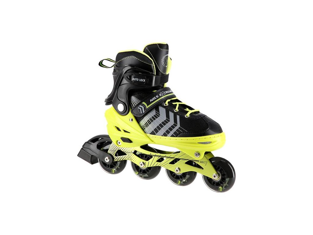 NILS Extreme NH18192 jsou kolečkové brusle 4v1 s vyměnitelným nožem na led, které jsou určeny pro začínající a středně pokročilé uživatele. Hliníkový podvozek je osazen měkkými PU kolečky s ložisky ABEC7 pro svižnou jízdu. Vnější bota je pomocí stisku tlačítka nastavitelná do čtyř velikostí, toto řešení umožňuje precizní přizpůsobení velikosti podle aktuálních potřeb anebo se používá jako "rostoucí bota", která "roste" spolu s nohou dítěte. Na špičce jsou ventilační otvory pro maximální prodyšnost. Vnitřní bota je vyrobena z kombinace semiše, síťoviny MESH, EVA a pěny o vysoké hustotě. Zapínání je řešenou klasickou trojkombinací - šněrování, řemínek se suchým zipem a dvousekční přezka. Součástí balení je sada šroubů a podložek pro přestavbu podvozku do konfigurace 2+1 a 2+2 a pár nožů na led, které jsou vyrobeny z nerez oceli s vysokým podílem uhlíku.