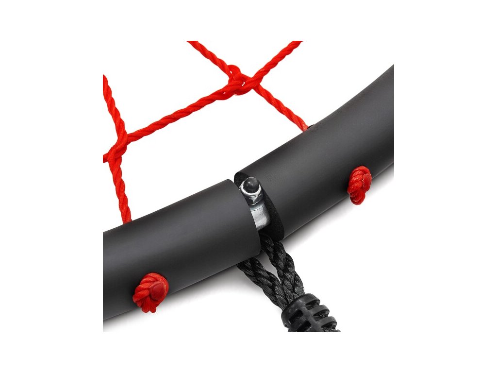 Rám o průměru 100 centimetrů je vyroben z ocelové kulatiny o průměru 25 milimetrů, na které je pro maximální bezpečí nalepena vysoká vrstva PE pěny. Polyetylénový výplet modelu NB5038 má průměr 5 milimetru a je maximálně odolný vůči povětrnostím vlivům jako je déšť a sníh, hnízdo tak nemusíte schovávat když zrovna začne pršet. Nosná, polyetylénová lanka mají průměr 10 milimetrů a délku 180 cm. Když tyto vlastnosti zkombinujeme tak získáme prostornou houpačku s nosností 150 kilogramů, na které se vyřádí i více dětí najednou.