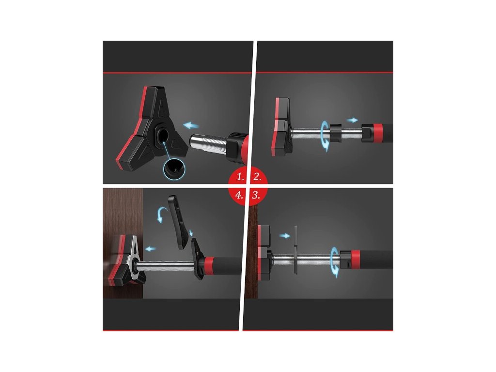 Po vytažení hrazdy z balení se na její konce nasadí koncovky. Hrazdu si na zemi roztáhneme tak, aby byla o několik centimetrů kratší, než je šířka zárubní a dotažením černých matic zajistíme délku hrazdy. DD400 vložíme do zárubní, pomocí dodávané vodováhy ji vyrovnáme a dotáhneme černé matice. Jakmile hrazda drží, tak si z koncovek vytáhneme klíč, který si prodloužíme pomocí nástavce a následně dotáhneme černé matice tak, aby hrazda pevně držela. Nástavec a vodováhu si uschováme pro další použití, klíče nacvakneme zpět do koncovek a můžeme začít s tréninkem.