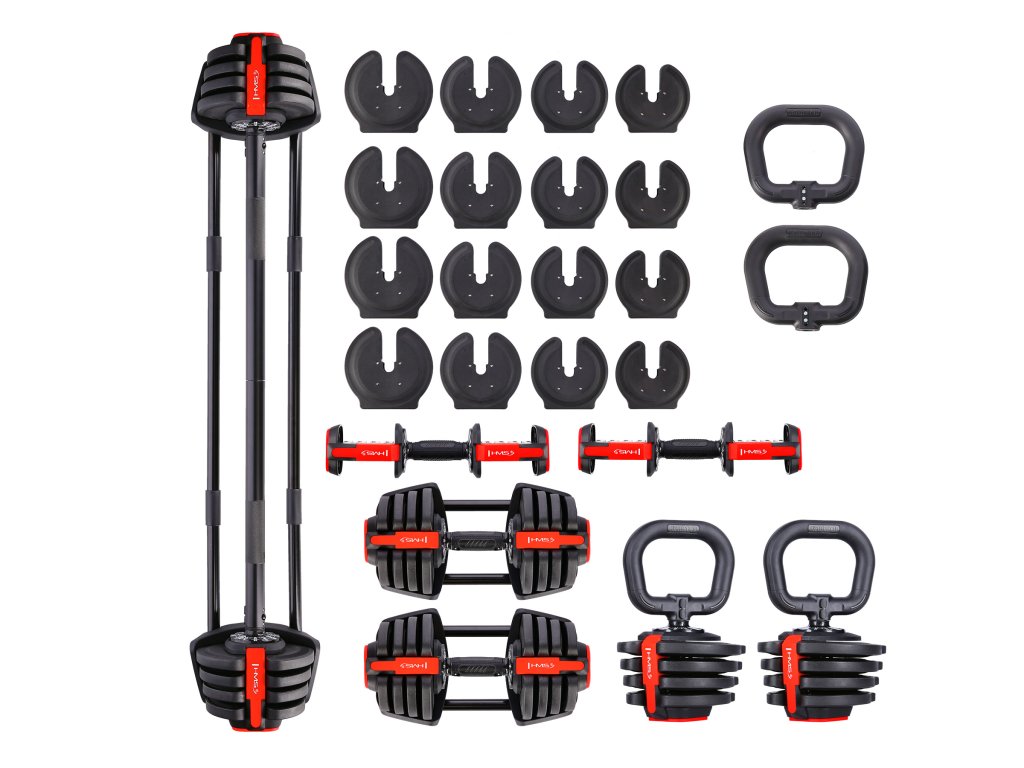 HMS SGR18 PRO SET 3v1 je sada variabilní - nastavitelné činky s možností sestavení jako jednoruční činka, obouruční činka, nebo kettlebell.
