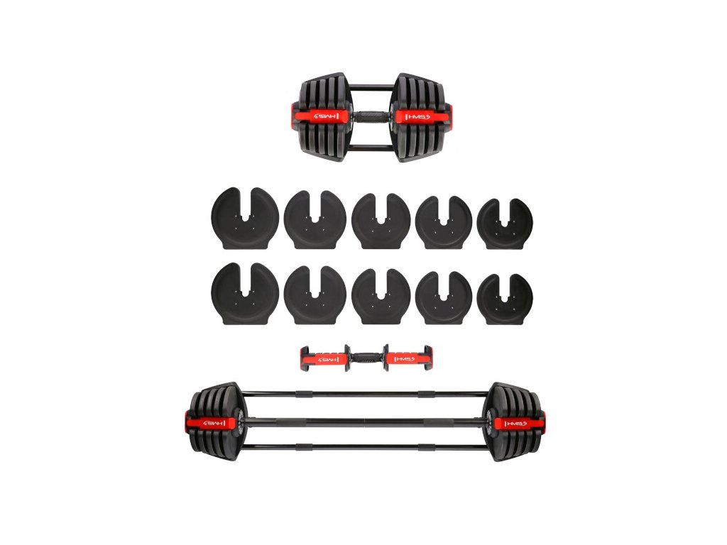 HMS SGR40 PRO SET 2v1 je sada variabilní - nastavitelné činky s možností sestavení jako jednoruční, nebo obouruční činka.