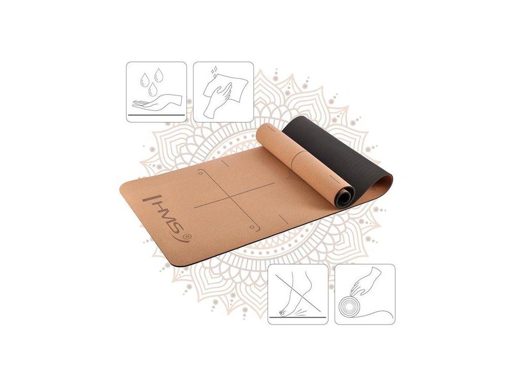 Podložka je vyrobena z kombinace TPE a korku, který zajišťuje spolehlivost, odolnost a přirozené antibakteriální vlastnosti. Korek, přírodní materiál, je šetrný k pokožce, hypoalergenní a ekologický. TPE, termoplastický elastomer, nabízí vynikající přilnavost, díky čemuž je podložka protiskluzová a bezpečná. Navíc díky své pružnosti a vlastnostem tvarové paměti se podložka po ohnutí nebo intenzivním používání vrací do původní podoby, což zajišťuje odolnost proti deformaci a dlouhodobé zachování očekávaného vzhledu. Tento materiál je také voděodolný, což usnadňuje péči a čištění. Díky tomu je podložka HMS ideální pro cvičení uvnitř i venku.