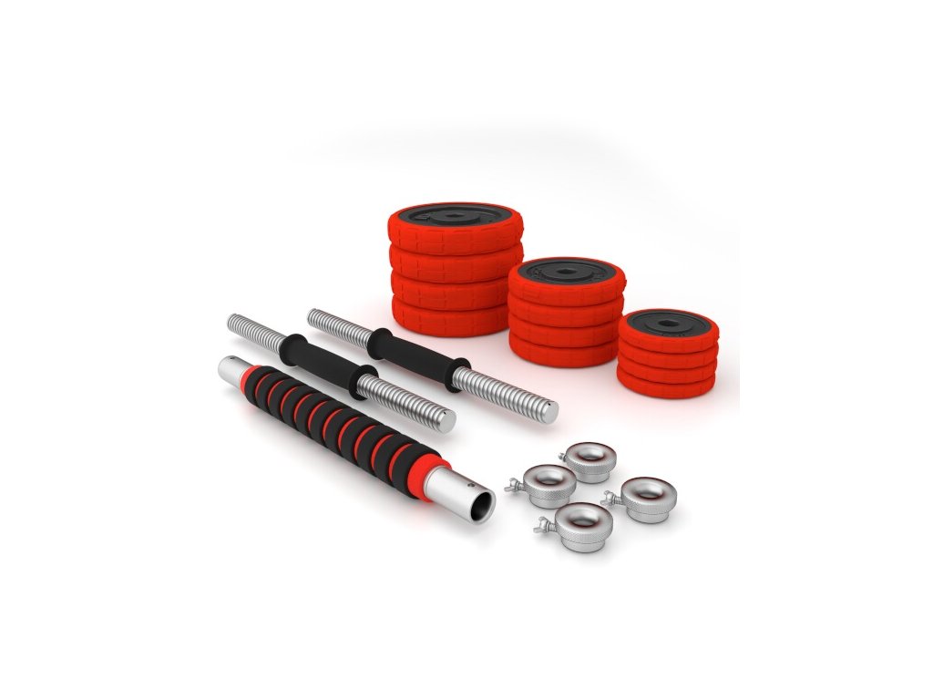 Činky jsou vyrobeny z vysoce kvalitní, lité oceli, která je zárukou dlouhé životnosti. Kotouče jsou opatřeny gumovým návlekem, který chrání jak činky, pak podlahu před poškozením při neopatrném odložení. Proti posunutí závaží se činky zajišťují šroubovacími zámky, které jsou dodatečně jištěny šroubem.