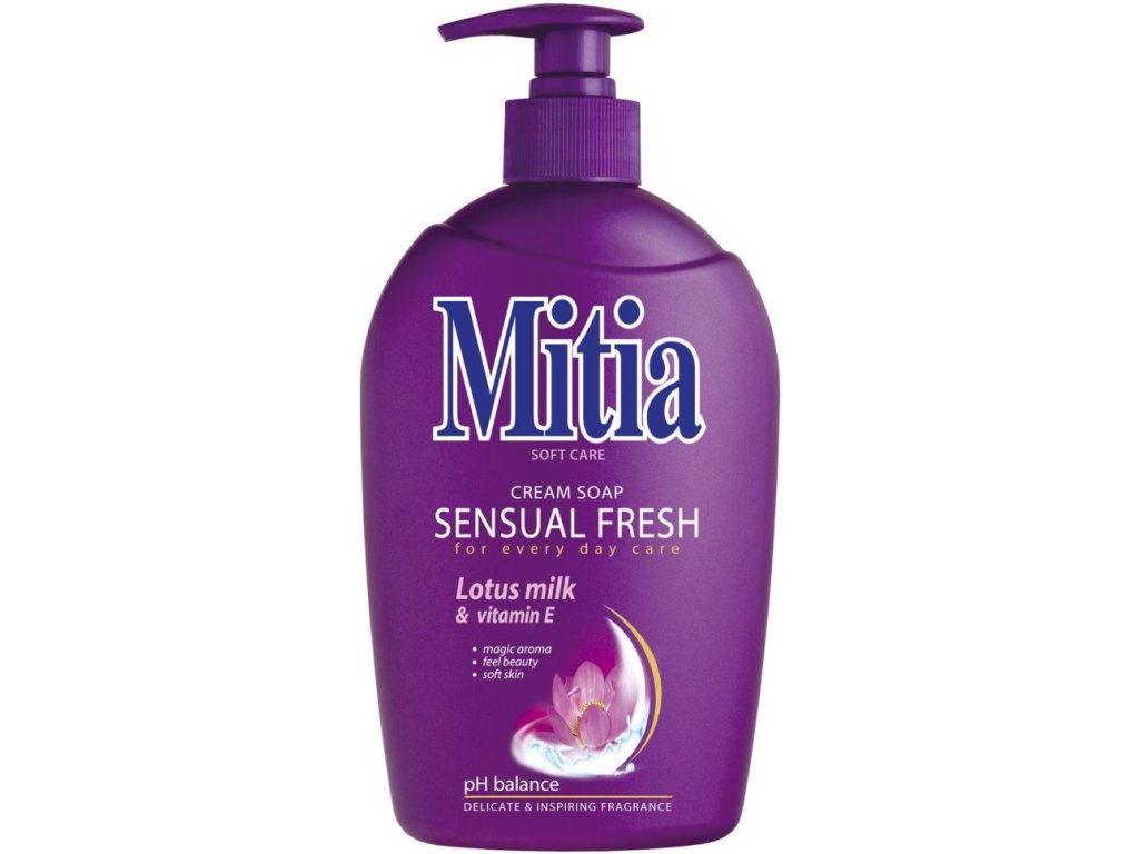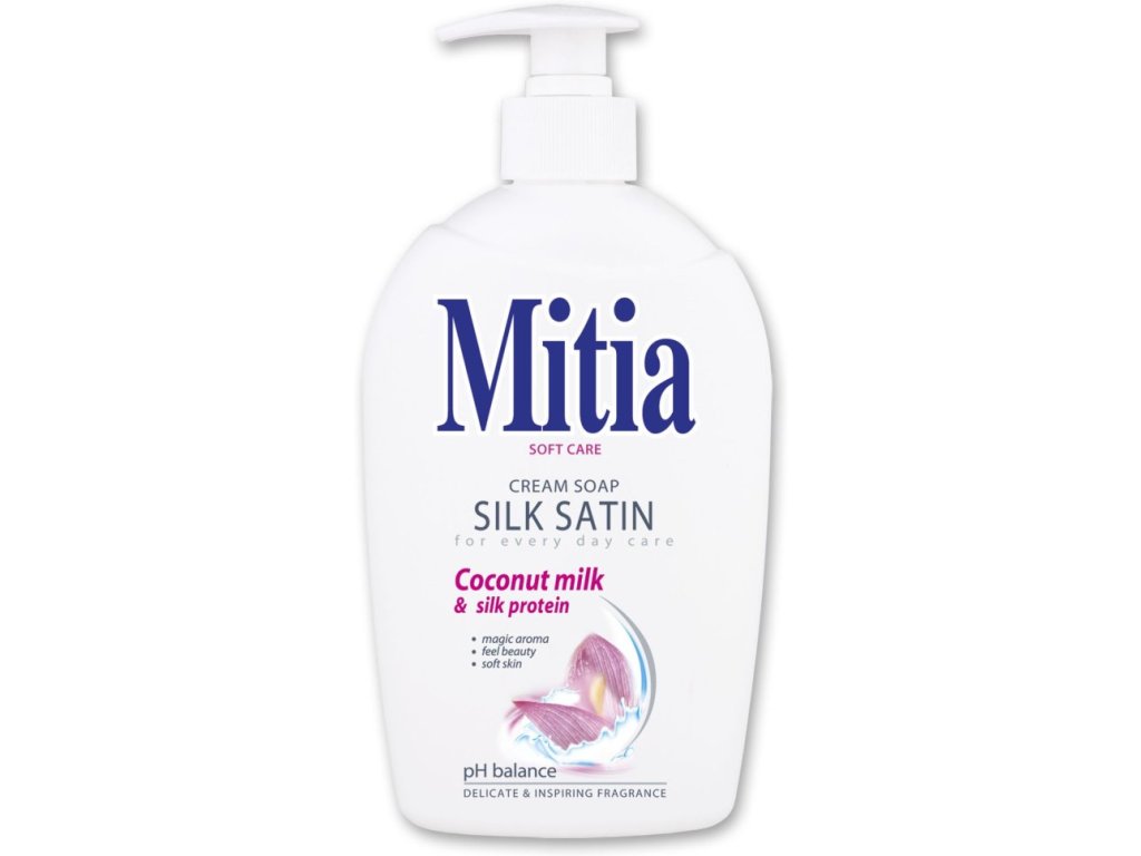 Mitia tekuté mýdlo s dávkovačem 500 ml poskytuje šetrné každodenní čištění rukou pro celou rodinu. Jemné krémové složení s pečujícími složkami pomáhá udržet pokožku rukou hebkou, vláčnou a chráněnou před vysušováním.