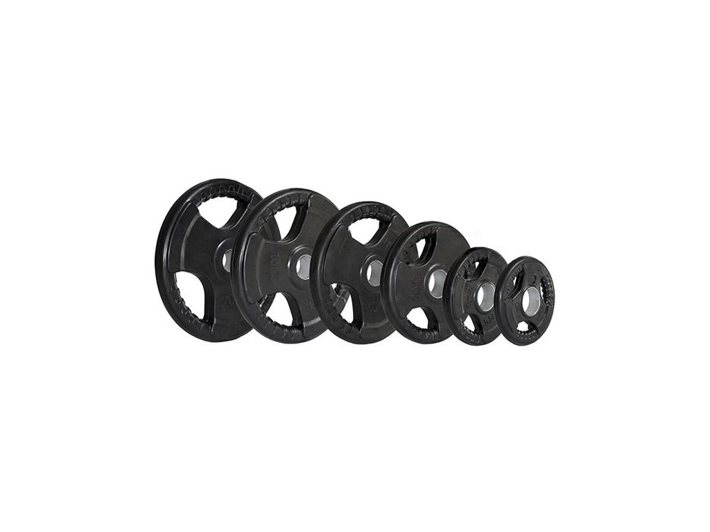 Olympijský, pogumovaný kotouč HMS Tri-grip je známkou kvality a precizního provedení. Tento talíř má otvor o průměru 50 mm, je tedy vhodný pro všechny typy olympijských os. Závaží disponuje třemi držadly pro snadnou manipulaci a pogumovaný povrch prodlužuje jeho životnost.