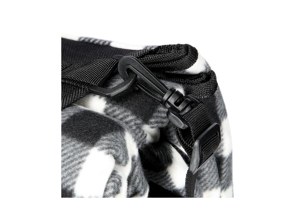 Deku lze snadno složit do praktické "tašky". Klopa se suchým zipem zabraňuje jejímu náhodnému rozbalení a nastavitelný popruh přes rameno a madlo umožňují deku pohodlně přenášet.