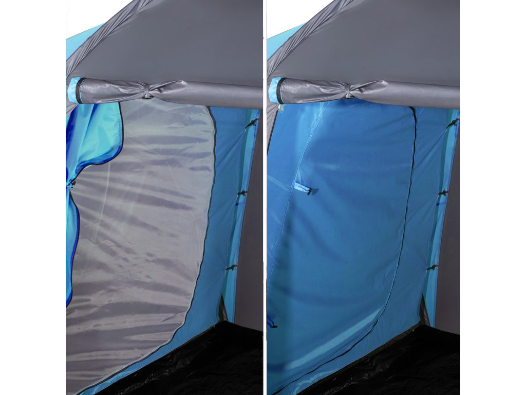 Highland nabízí dvě samostatné ložnice, každou pro tři osoby, a velkou předsíň o rozměrech 210 × 210 × 200 cm. To je dostatek prostoru k pohodlnému pobytu uvnitř stanu – ať už odpočíváte, nebo se schováváte před deštěm.