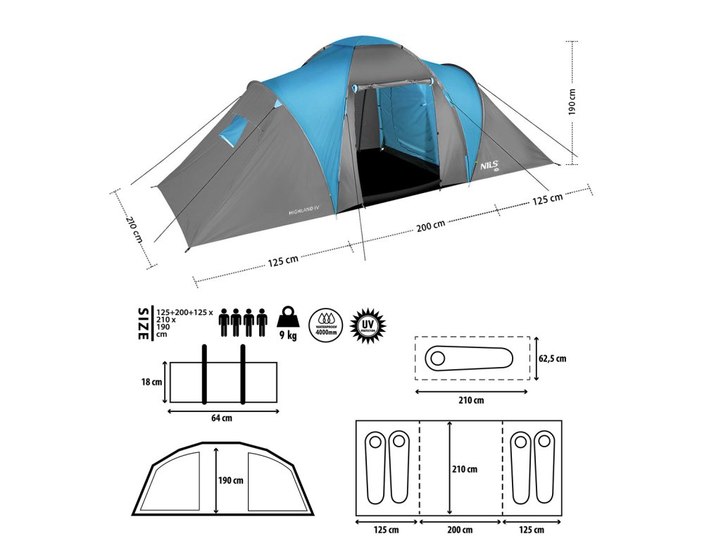 Rodinný stan Nils Camp NC6431 Highland IV je tím nejlepším řešením pro milovníky víkendových výletů k jezeru a dlouhého prázdninového kempování. Highland IV je menší verze modelu NC6031 Highland. Stan má dvě samostatné, dvoulůžkové ložnice a velkou předsíň s podlážkou, kde můžete strávit deštivé večery nebo uložit vybavení pro kempování. Stan pojme 4 osoby, díky čemuž je mimořádně prostorný a pohodlný.
