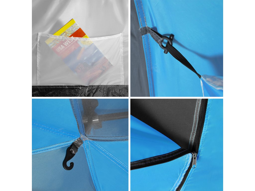 Navíc je stan vybaven čtyřmi vnitřními kapsami, kam schováte své věci, a dvěma úchyty pod stropem, díky kterým můžete zavěsit lampu.