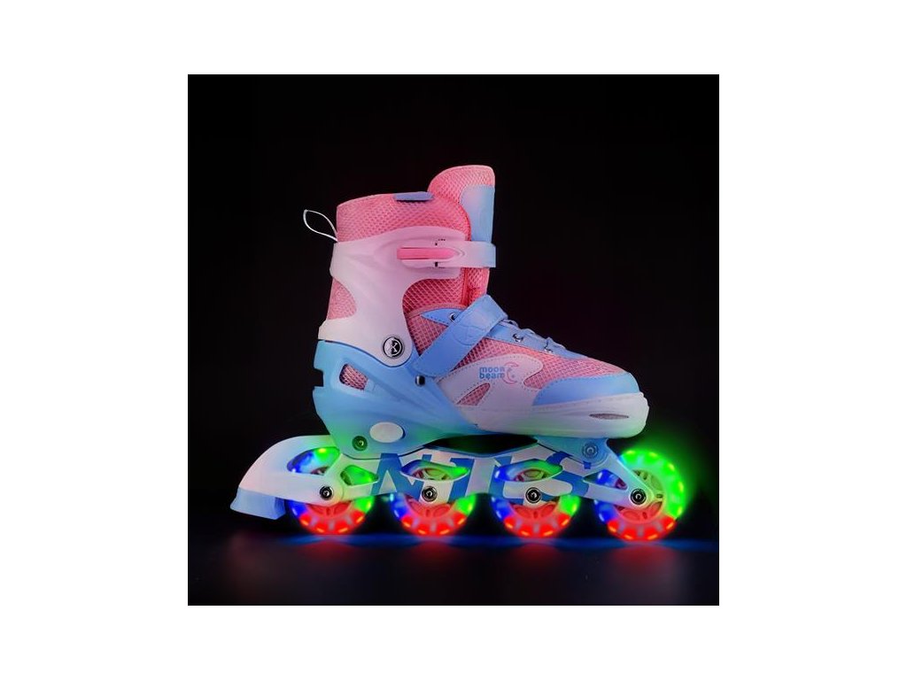 Kolečkové brusle jsou vyrobeny z odolných materiálů: bota je vyrobena z PP a PE a rám je vyroben z hliníku, což zajišťuje dostatečnou stabilitu. PU kolečka jsou vybavena poutavými LED diodami, které se během jízdy rozsvítí – nejenže vypadají atraktivně, ale také zlepšují viditelnost. Ložiska ABEC 7 zajišťují plynulou a tichou jízdu, ideální pro rekreační cestování a učení pokročilejších manévrů.