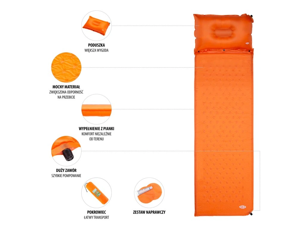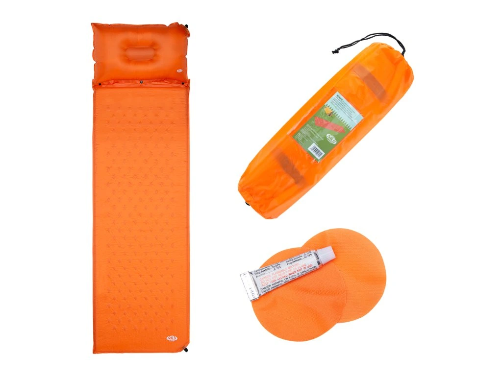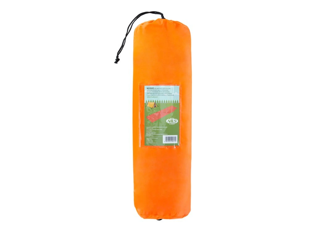 Samonafukovací karimatka NILS CAMP NC4345 zajistí kvalitní spánek během kempování a dovolených pod stanem. Podložka je ale vhodná i k vodě a všude tam, kde si chcete příjemně poležet. Samonafouknutí zajišťuje vnitřní, pěnový materiál s otevřenými póry. Po povolení ventilu do sebe nasává vzduch a dostává se tak do původního stavu. Závěrem je ještě potřeba podložku dofouknout na požadovanou tvrdost. Skládání se provádí otevřením ventilu a srolováním od opačné strany, než je ventil. Karimatku poté vložíte do dodávaného vaku. Na model NC4345 byl použit velice odolný polyester 190T potažený vrstvou PVC, tato kombinace zajišťuje vysokou odolnost a karimatka se dá položit i na nerovný povrch. Polštářek je odnímatelný a oproti karimatce není vyplněn pěnou a je potřeba ho celý nafouknout. Součástí balení je také opravná sada, která se hodí v případě poškození.