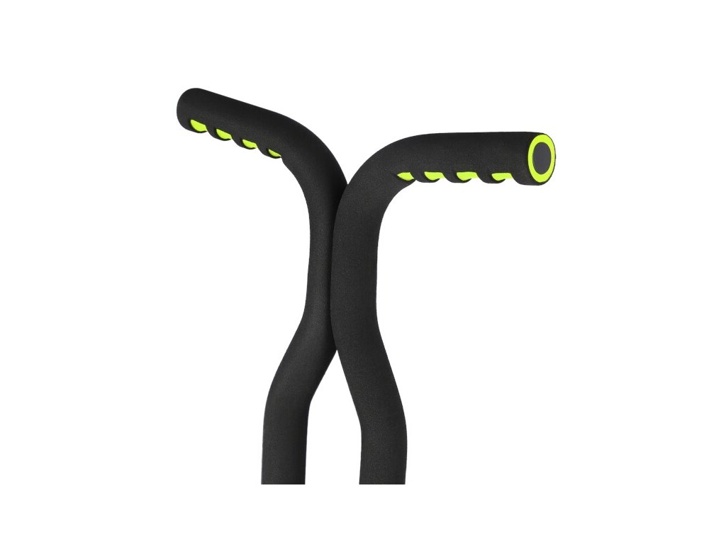 Ocelový rám garantuje nosnost 70 kilogramů. Rukojeti jsou potaženy PU pěnou, která se přizpůsobí stisku dlaně, zajistí komfortní úchop a zamezí zklouznutí dlaně z madla. Na stupačky byl použit tvrzený plast a jejich povrch je opatřen drážkamy proti sklouznutí boty. Kruhová koncovka skákací tyče je osazena gumou, její tvar umožňuje provádění skoků do všech směrů.