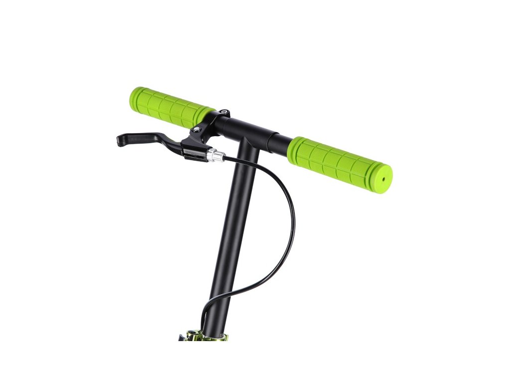 Zadní blatník slouží jako přítlačná brzda, která ještě podtrhuje brzdný účinek mechanické brzdy ovládané lankem z páčky na řídítkách, ty jsou opatřeny gumovými rukojeťmi, které zajišťují pevný a pohodlný úchop. Výšku řídítek lze nastavit do 3 úrovní v rozsahu od 75 do 102 cm.