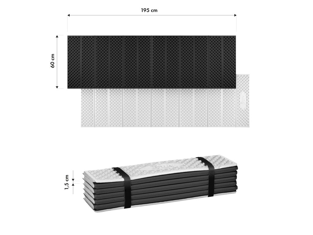 Podložka má délku až 195 cm, což umožňuje pohodlný odpočinek i pro vyšší osoby. Šířka 60 cm a tloušťka 1,5 cm zajišťují pohodlnou oporu a izolaci od podkladu, a to i na nerovném terénu.