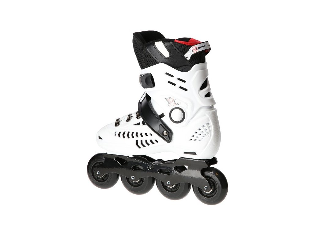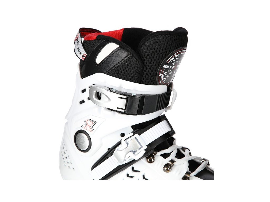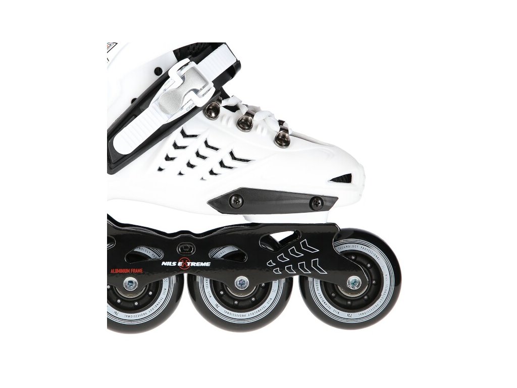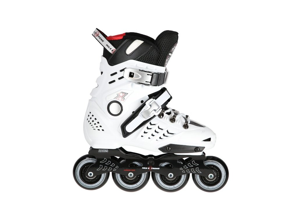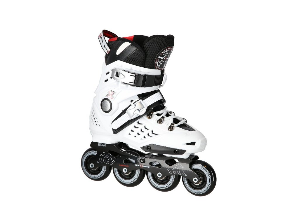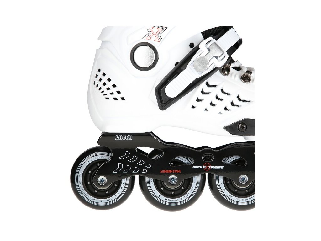 Kolečkové brusle NILS Extreme NA20001 jsou určeny primárně pro freeride a slalom. Jejich konstrukce je založena na lehké, větrané botě s anatomickou stélkou zaručující vysokou stabilitu paty, polypropylenovém skeletu a hliníkové liště vyrobené pomocí vstřikování. Jako zapínání bylo použito šněrování, dvojsekční přezky a kvalitní spony s napínacím mechanismem. Na vnější straně boty nalezneme slider, tak často užívaný při freeridu.