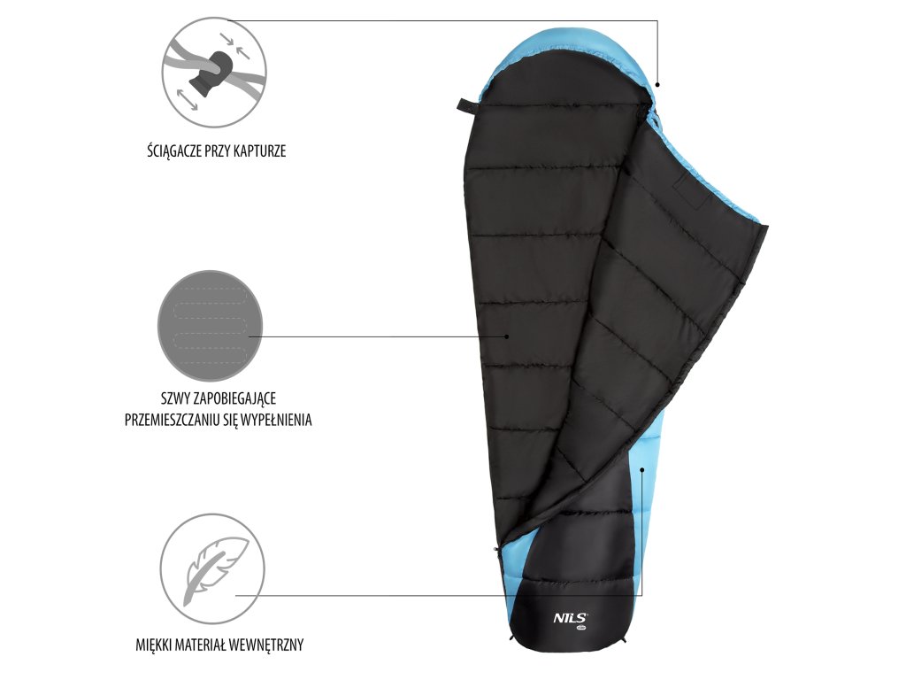 Spací pytel, typu mumie, NILS Camp NC2012 využijete během chladných nocí při kempování, spaní pod širým nebem a nebo jen při stanování na zahradě.