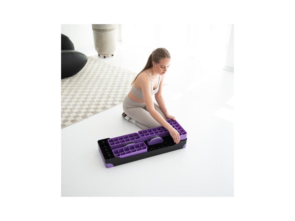 Stejně jako jeho menší protějšek má i AS008L balanční podložky, které se upevňují ze spodní strany stepu. Díky nim se klasický můstek mění v pomůcku pro trénink rovnováhy a stabilizace, zapojuje posturálních svaly a zlepšuje motorickou koordinaci.