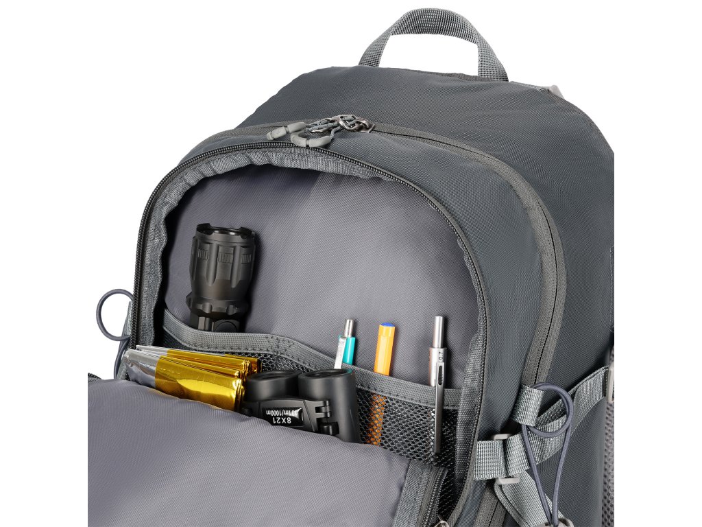 Na přezce hrudního popruhu je integrovaná záchranná píšťalka pro větší bezpečnost v nouzových situacích. Batoh nabízí také přídavný panel úchytů pro upevnění příslušenství, jako jsou například trekové hole. Dvě boční síťované kapsy a kapsy na zip na bederním pásu umožňují uložit předměty, které chcete mít po ruce, například telefon.