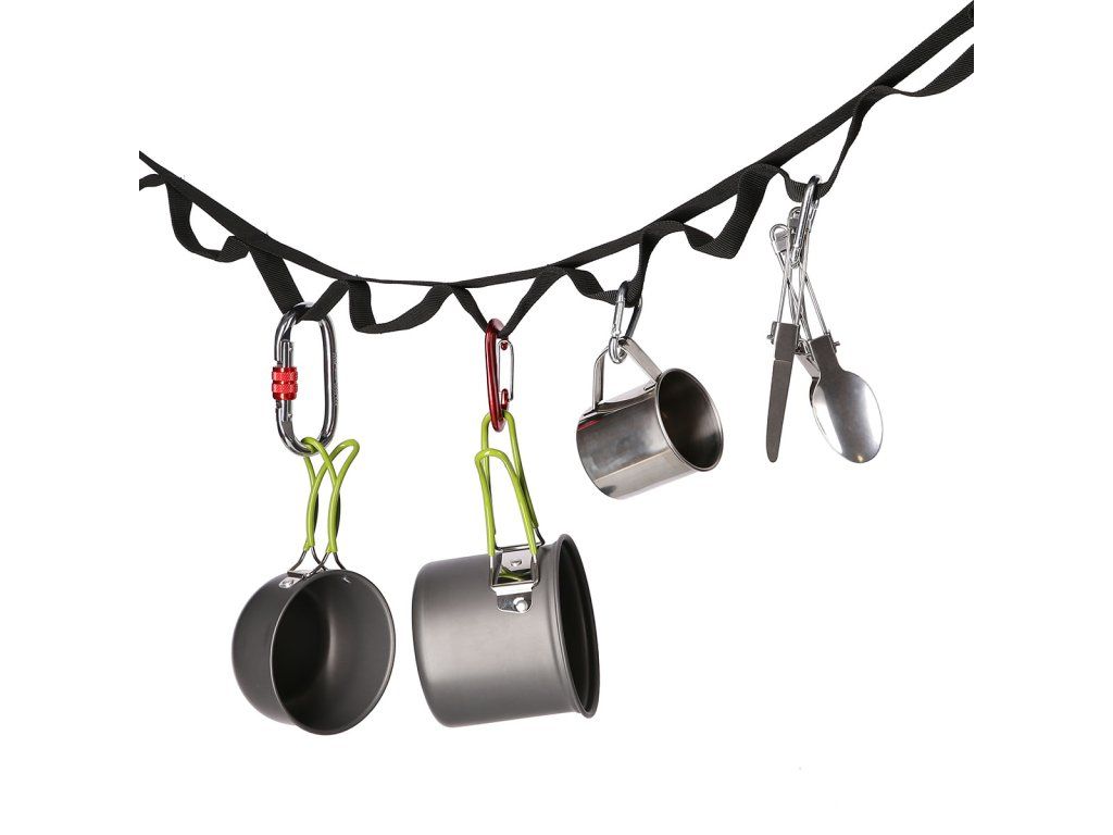 NILS Camp NC1771 je závěsný "lanový" organizér s 19-ti oky pro zavěšení a organizaci kempingového vybavení.